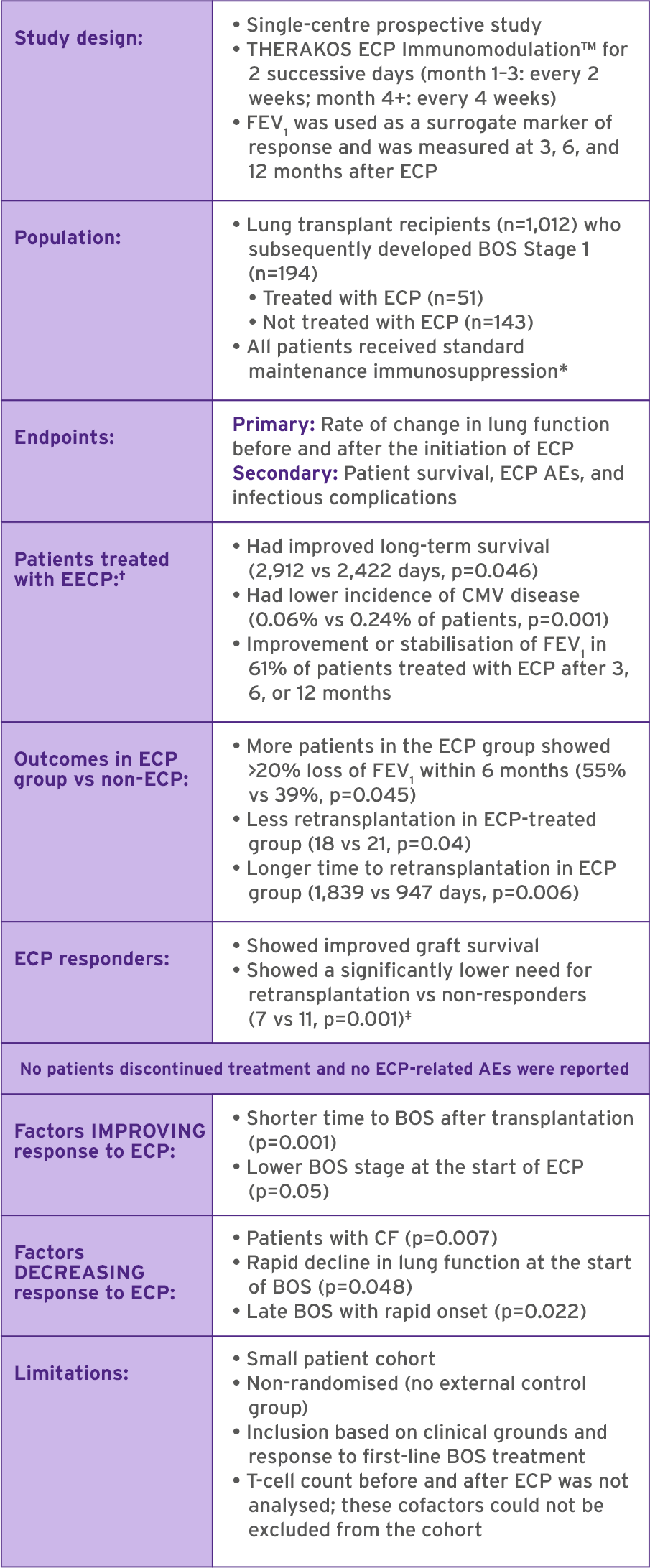 AE, adverse event; BOS, bronchiolitis obliterans syndrome; CF, cystic fibrosis; CMV, cytomegalovirus; ECP, extracorporeal photopheresis; FEV1, forced expiratory volume in 1 second.