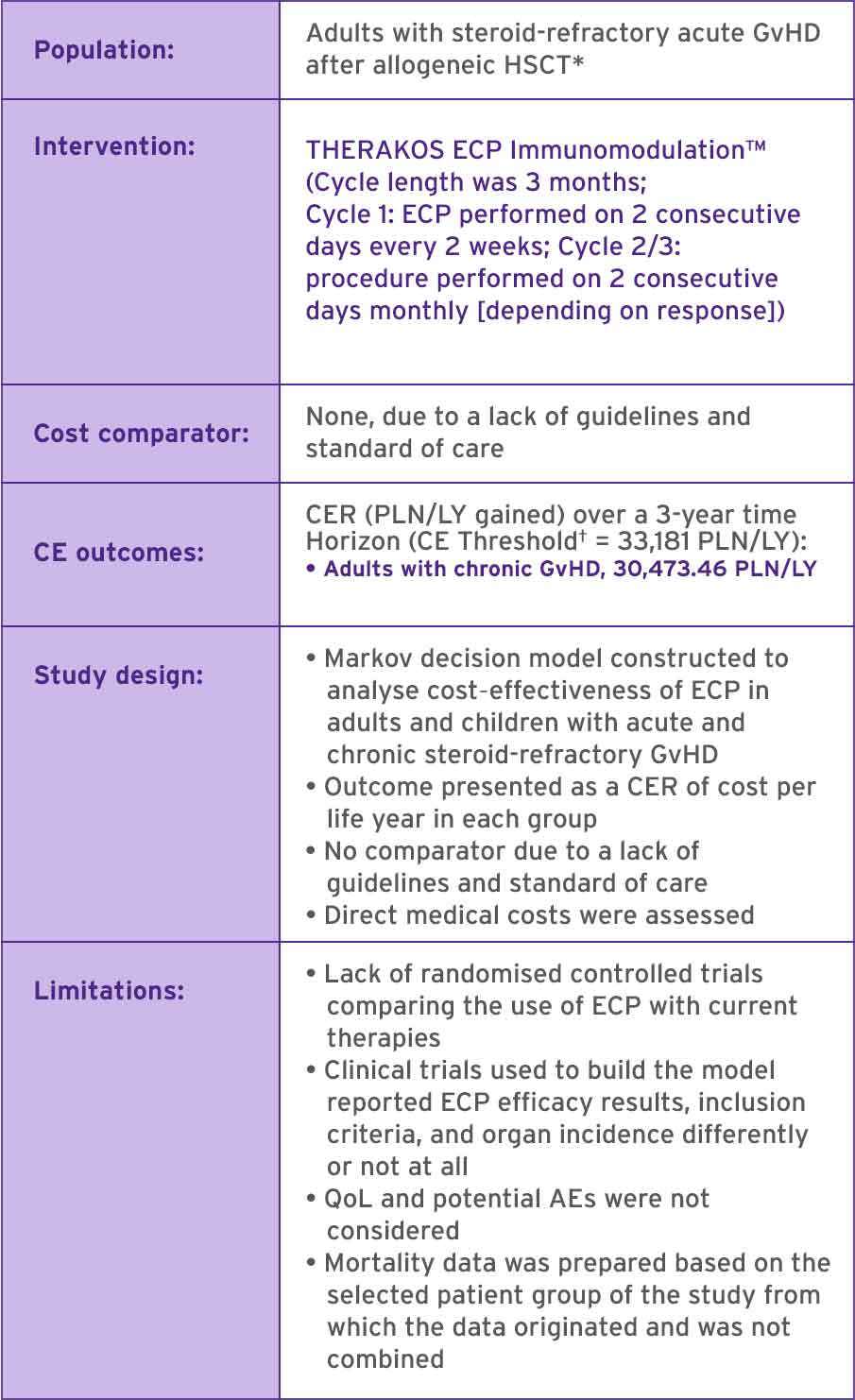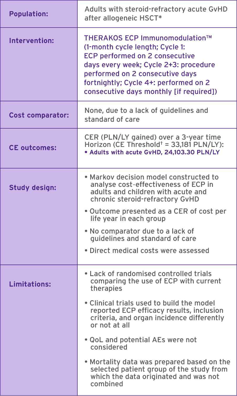 AE, adverse event; CE, cost-effectiveness; CER, cost-effectiveness ratio; ECP, extracorporeal photopheresis; GDP, gross domestic product; GvHD, graft-versus-host disease; HSCT, haematopoietic stem cell transplantation; LY, life-year; PLN, Polish zloty (currency of Poland); QoL, quality of life.